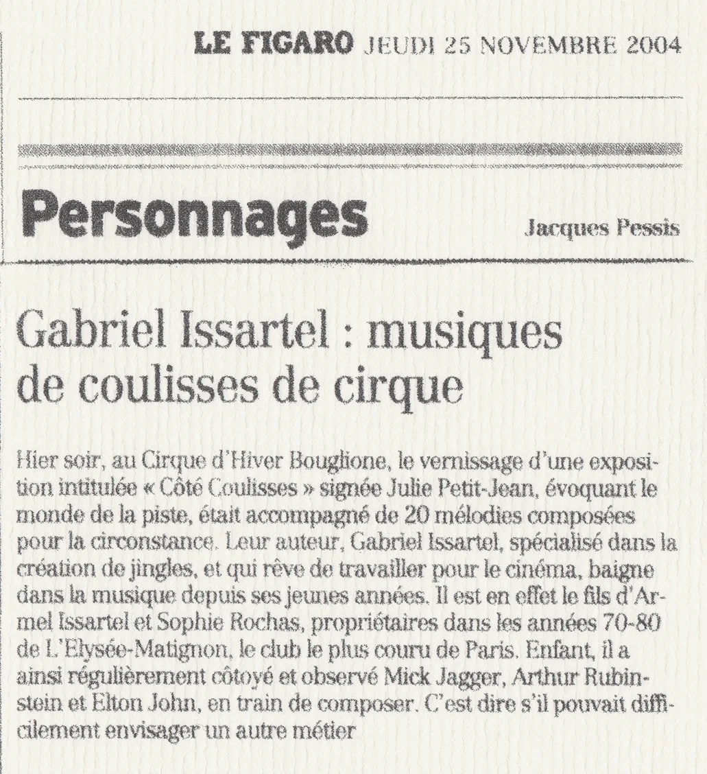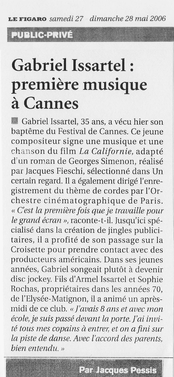 Dès son plus jeune âge, Gabriel Issartel se passionne pour le cinéma et ses musiques. Petit-fils du couturier et parfumeur Marcel Rochas, Gabriel grandit dans l'univers artistique de ses parents, où se croisent Jacques Prévert, Rudolf Noureev, Arthur Rubinstein et Serge Gainsbourg.